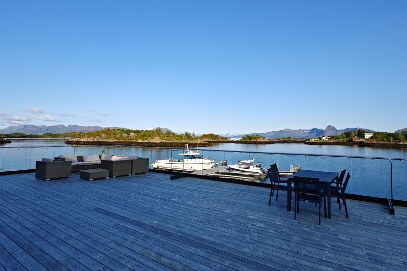 Ringstad Resort offers modern, well-maintained facilities. The main building houses the reception, where the staff are happy to help and can also arrange excursions. There is also a lounge and a restaurant, with large windows overlooking the water. In summer, the spacious terrace is a lovely spot for a cup of coffee or a refreshing drink. For those who truly want to unwind, two outdoor hot tubs are available. A sauna will be added in the near future.