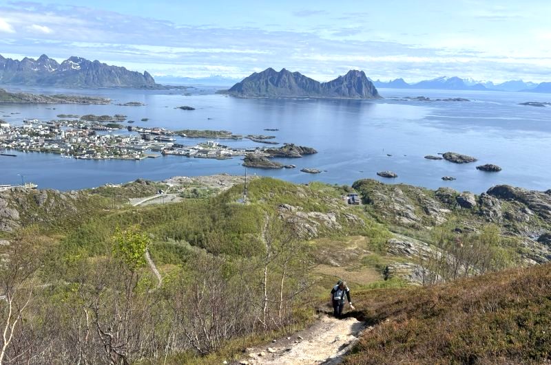 De bergtop Mannen, op 400 meter boven zeeniveau, biedt een spectaculair uitzicht op de hagelwitte zandstranden van zowel Haukland Beach als Uttakleiv Beach. Vertrek aan de parkeerplaats bij het nieuwe bezoekerscentrum van Haukland Beach en volg de grindweg landinwaarts, weg van de kust. Na ongeveer 500 meter neem je links het pad dat omhoog loopt langs de bergflank. Het pad is goed begaanbaar, maar kan bij regenweer glad en modderig zijn. Voorzie dus zeker goede wandelschoenen. Als alternatief kun je ook kiezen voor de kustroute tussen Haukland en Uttakleiv. Deze route van 8 kilometer is vlak, goed onderhouden en geschikt voor het hele gezin.